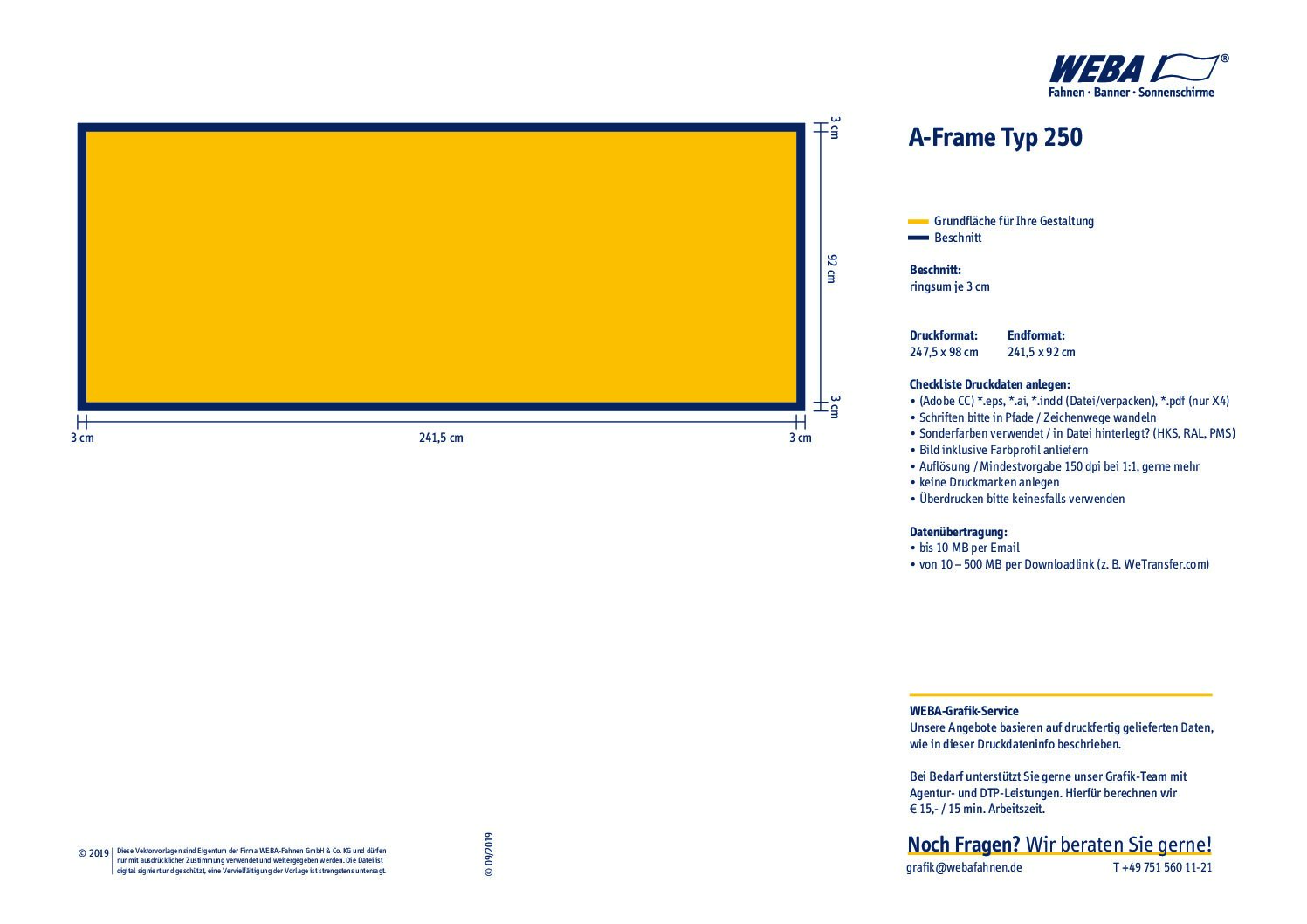 14 Okt. A-Frame Druckdateninformation Typ 250 A-Frame Druckdateninformation Typ 250 Das WEBA A-Frame ist die mobile Lösung mit doppelter Werbefläche. Hierfür wird weder ein Zaun, n... Weiterlesen