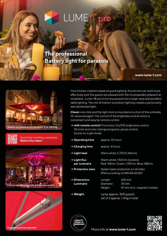 15 Sep. Lume-1 pro – Video (EN) installation instructions- Lume-1 pro The battery-operated Lume-1® enables complete parasol lighting without the need of any power sup... Weiterlesen