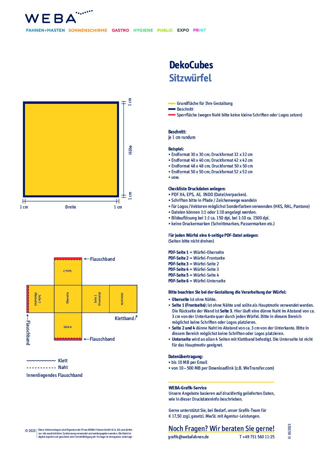 Für jeden DekoCube stehen individuell bedruckbare Flächen zur Verfügung. Soll jeder Sitzwürfel gleich oder anders aussehen? Sollen nur einzelne Seiten variiert werden, um die Sitzwürfel später bei Bedarf zu einer Wand zusammenzustellen? Bei der Gestaltung der Sitzwürfel können Sie Ihrer Kreativität freien Lauf lassen!