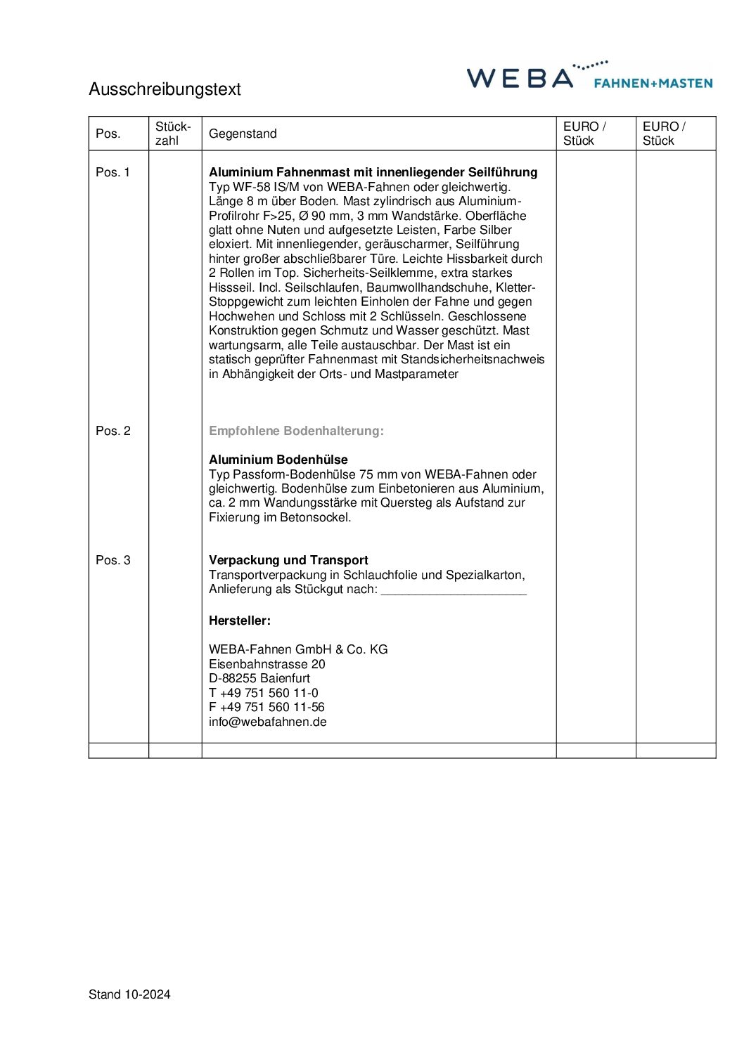 Fahnenmasten WF 58 mit innenliegender Seilführung – Ausschreibungstext