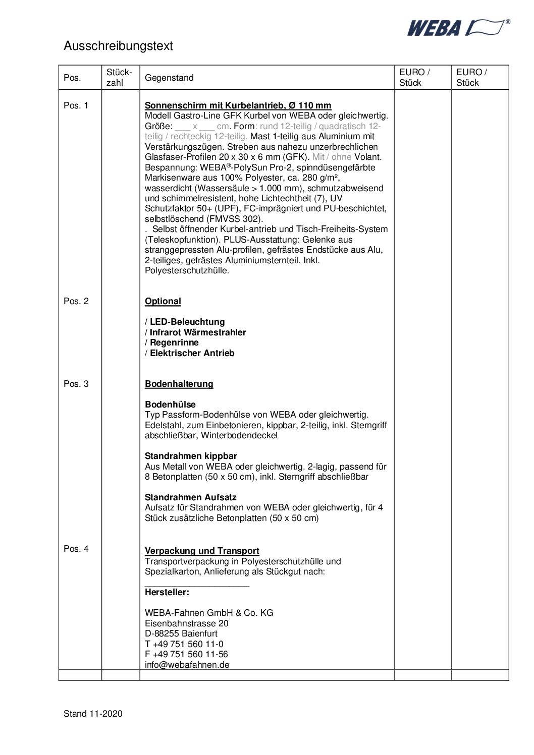 Sonnenschirm GFK Kurbelantrieb 110mm – Ausschreibungstext
