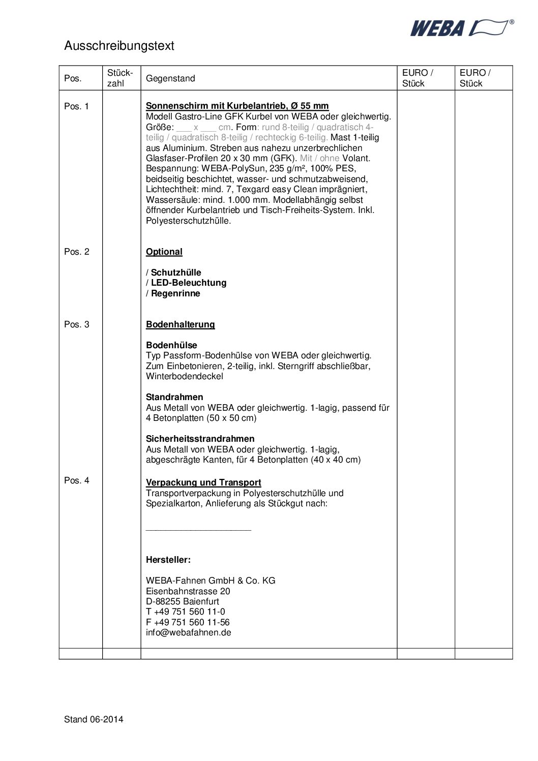 Modell Gastro-Line GFK Kurbel von WEBA oder gleichwertig. Größe: ___ x ___ cm. Form: rund 8-teilig / quadratisch 4- teilig / quadratisch 8-teilig / rechteckig 6-teilig. Mast 1-teilig aus Aluminium. Streben aus nahezu unzerbrechlichen Glasfaser-Profilen 20 x 30 mm (GFK). Mit / ohne Volant. Bespannung: WEBA-PolySun, 235 g/m², 100% PES, beidseitig beschichtet, wasser- und schmutzabweisend, Lichtechtheit: mind. 7, Texgard easy Clean imprägniert, Wassersäule: mind. 1.000 mm. Modellabhängig selbst öffnender Kurbelantrieb und Tisch-Freiheits-System. Inkl.