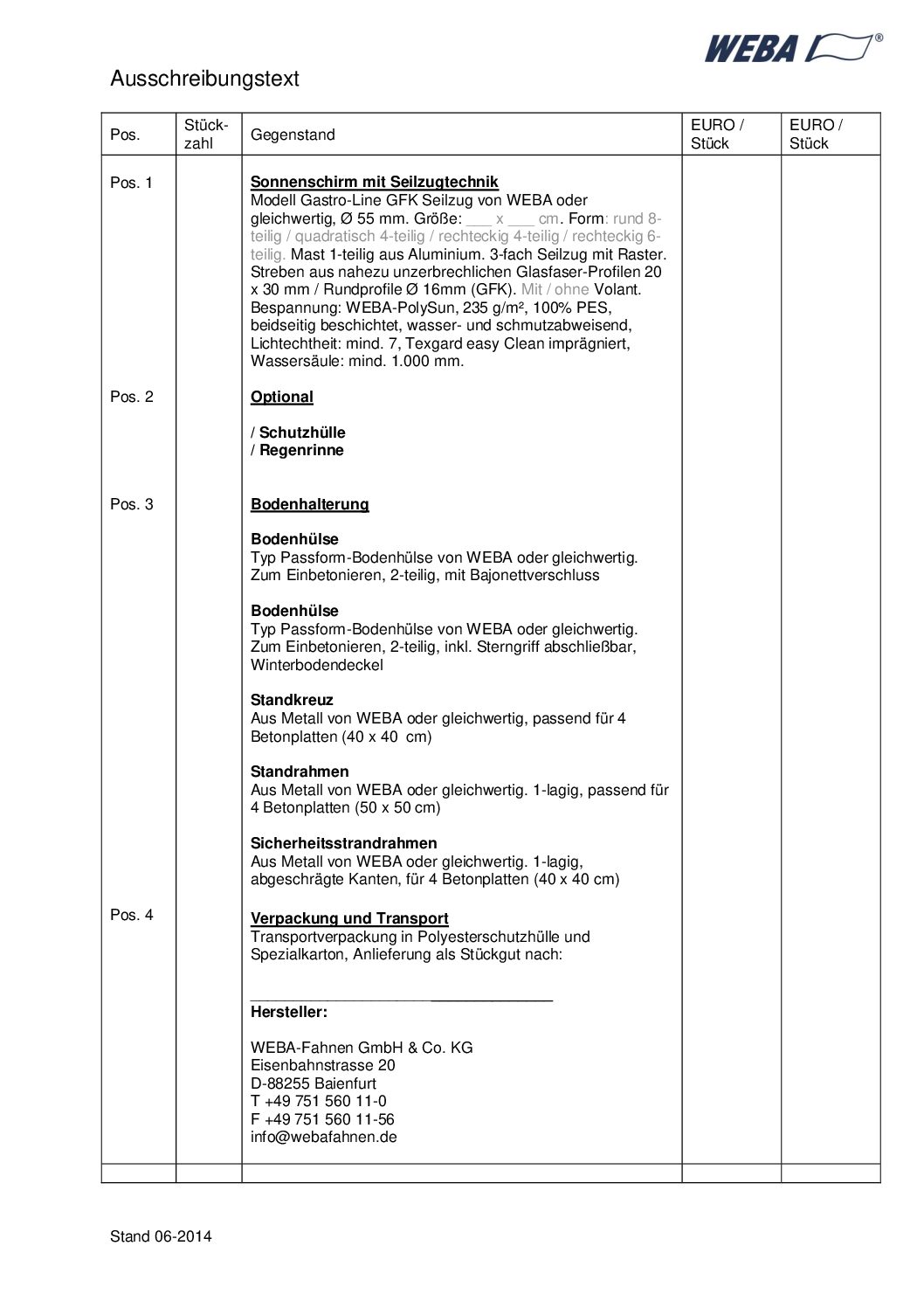 Modell Gastro-Line GFK Seilzug von WEBA oder gleichwertig, Ø 55 mm. Größe: ___ x ___ cm. Form: rund 8-teilig / quadratisch 4-teilig / rechteckig 4-teilig / rechteckig 6-teilig. Mast 1-teilig aus Aluminium. 3-fach Seilzug mit Raster. Streben aus nahezu unzerbrechlichen Glasfaser-Profilen 20 x 30 mm / Rundprofile Ø 16mm (GFK). Mit / ohne Volant. Bespannung: WEBA-PolySun, 235 g/m², 100% PES, beidseitig beschichtet, wasser- und schmutzabweisend, Lichtechtheit: mind. 7, Texgard easy Clean imprägniert, Wassersäule: mind. 1.000 mm.