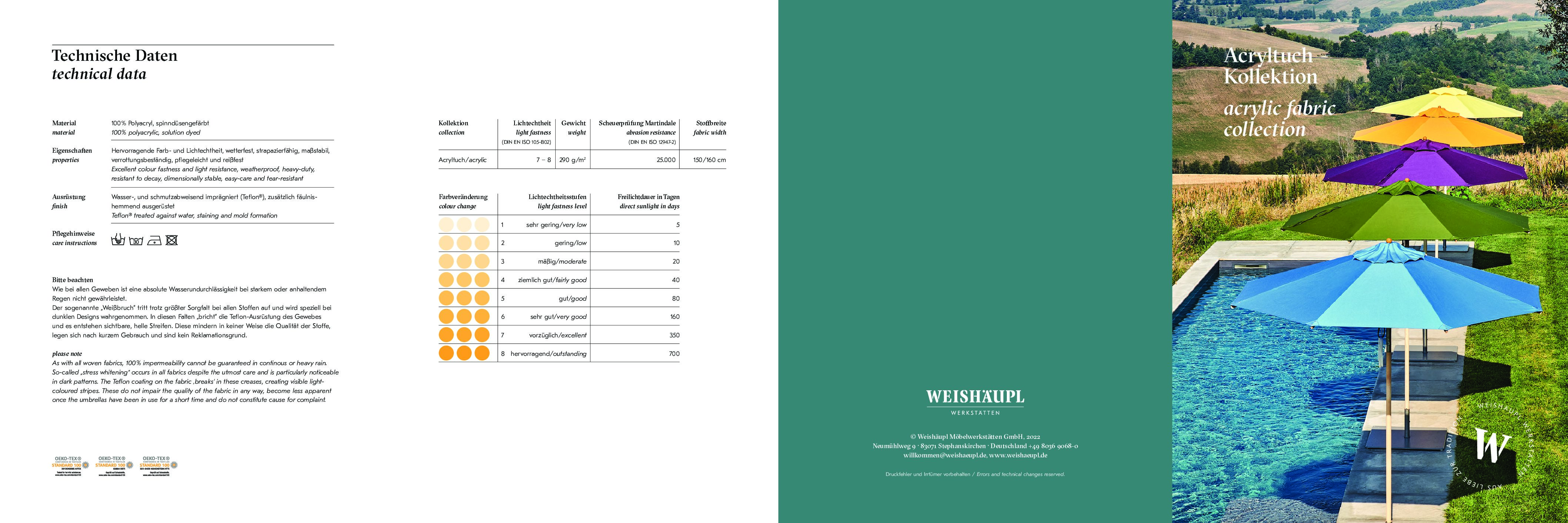 14 Okt. Weishäupl – Stoffkollektion Acryltuch – Technische Daten Weishäupl - Stoffkollektion Acryltuch - Technische Daten Eigenschaften: Hervorragende Farb- und Lichtechtheit, wetterfest, strapazierf... Weiterlesen
