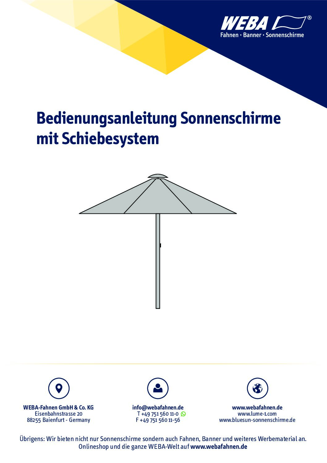 14 Okt. Sonnenschirme mit Schiebesystem – Bedienungsanleitung Sonnenschirme mit Schiebesystem - Bedienungsanleitung Push your Außengastro! Der bewährte Einsteiger-Schirm: solide, günstig und zuve... Weiterlesen