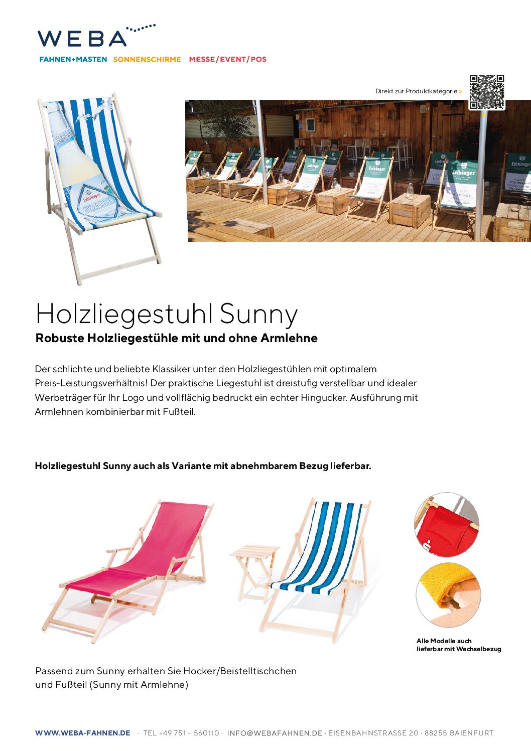 30 Okt. Liegestuhl Sunny – Flyer Liegestuhl Sunny - Flyer Der WEBA Holz-Liegestuhl Sunny zeigt, wie bequem Werbung sein kann. Größe: 148 x 61 x 6 cm (zusammengeklap... Weiterlesen